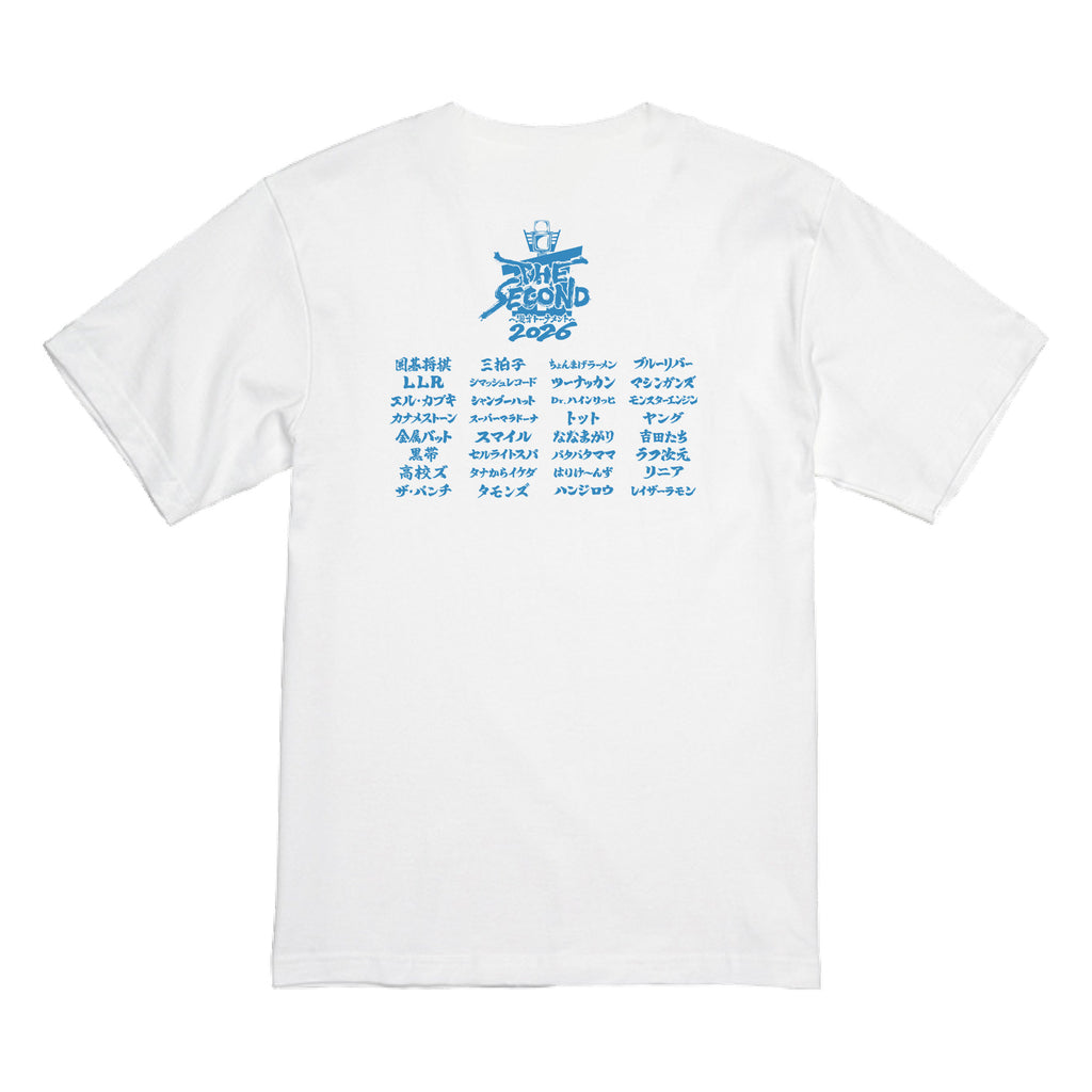 『THE SECOND~漫才トーナメント~2026』公式グッズの販売決定!背面に32組の出場者名を刻んだ「32組ネームTシャツ」になります。【素材】綿100%【サイズ】Mサイズ:身丈69cm/身幅52cm/肩幅46cm/袖丈20cmLサイズ:身丈73cm/身幅55cm/肩幅50cm/袖丈22cmXLサイズ:身丈77cm/身幅58cm/肩幅54cm/袖丈24cm【注意事項】※本商品は2026年5月上旬より順次発送を開始いたします。※後日、改めて受注・販売を再開する場合がございます。※画像は環境により色合いが異なって見える場合がございます。※お届け時期が異なる他の商品を同時にご注文の場合は一番遅い発送日時にあわせての出荷となりますのでご注意ください。※ご注文を頂いた時点では在庫有りと表示されている商品でも、システム上のタイムラグや同一商品への注文集中により、ご注文後に在庫切れとなる場合がございます。※在庫切れの場合にはキャンセル扱いとさせていただく場合がございますので、あらかじめご了承ください。