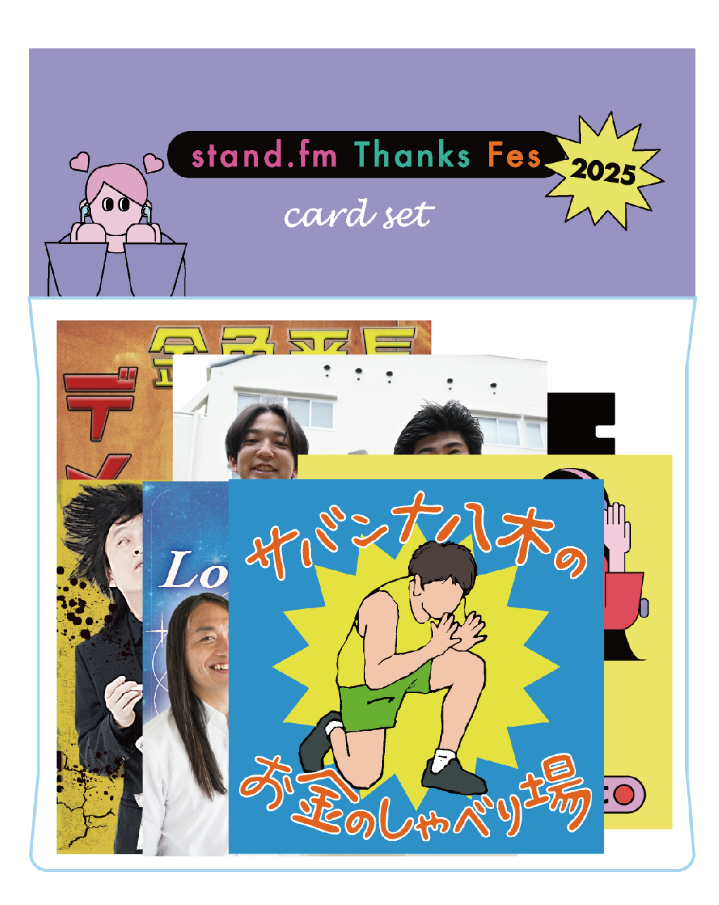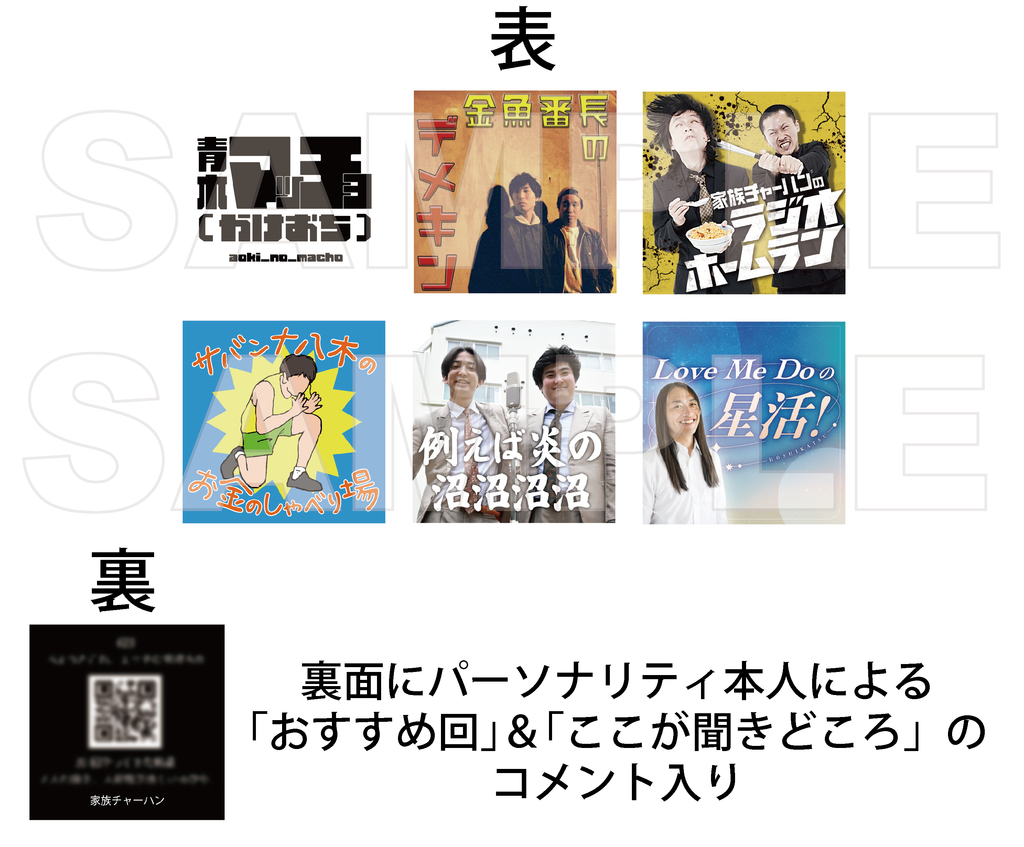 パーソナリティ本人による「おすすめ回」&「聞きどころ」が裏面に! コレクションはもちろん、友達に渡して番組を紹介したり「あの回」を振り返ったり集めて・配って・楽しいカードセット!※写真5枚目のキーホルダーは別売りです