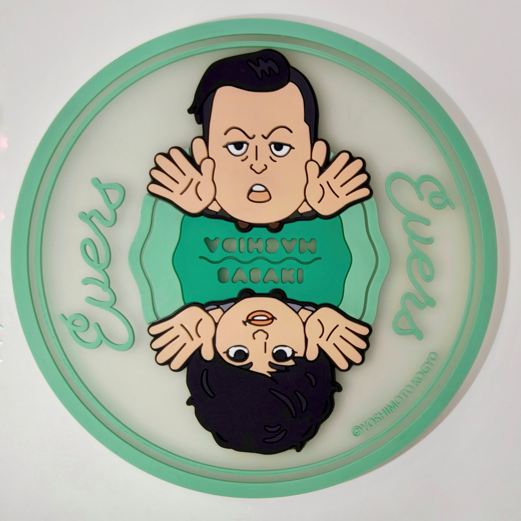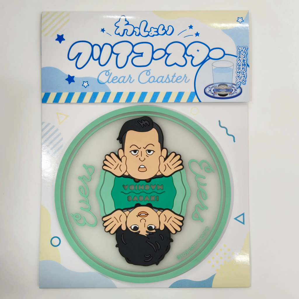 クリアのコースターに手を挙げたコンビのイラストがプリントされています。