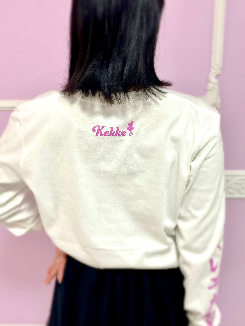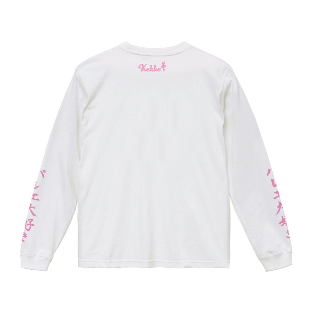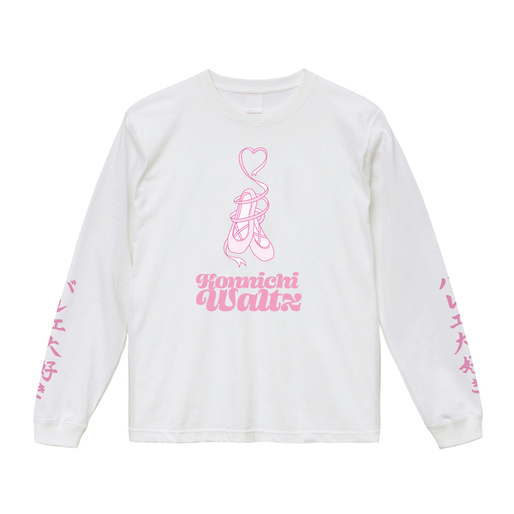 『Kekke』から待望の新アイテム登場! 定番の挨拶「こんにちワルツ」をおしゃれにかわいくデザインした長袖Tシャツです。 両袖には「バレエ大好き」をプリントすることで、かわいいだけじゃないアクセントに。