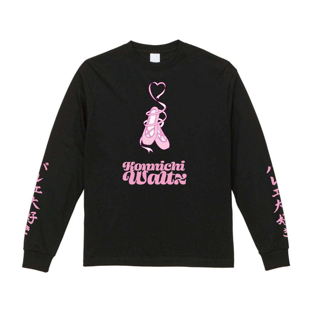『Kekke』から待望の新アイテム登場! 定番の挨拶「こんにちワルツ」をおしゃれにかわいくデザインした長袖Tシャツです。 両袖には「バレエ大好き」をプリントすることで、かわいいだけじゃないアクセントに。